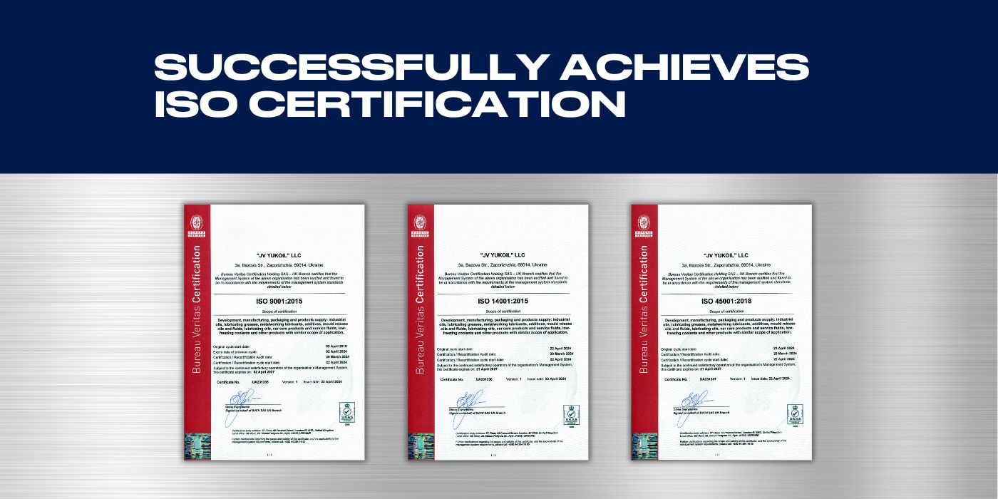ТОВ «СП ЮКОЙЛ», лідер з виробництва та постачання мастильних матеріалів в Україні, з радістю оголошує про успішне проходження сертифікації трьох міжнародних стандартів ISO у квітні 2024 року.