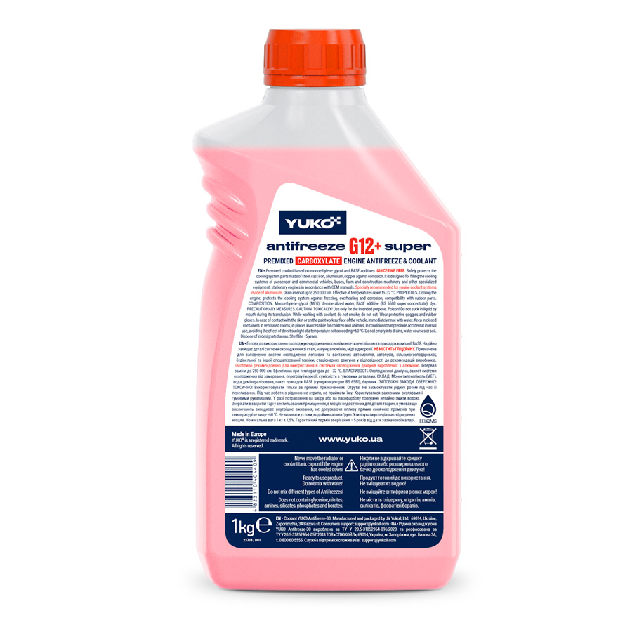 YUKO Antifreeze Super G12+ (червоний) - захистить ваш двигун від замерзання, перегріву, корозії та формування шкідливих відкладень. Надійний захист металевих деталей двигуна з чавуну, алюмінію, міді та сталі.