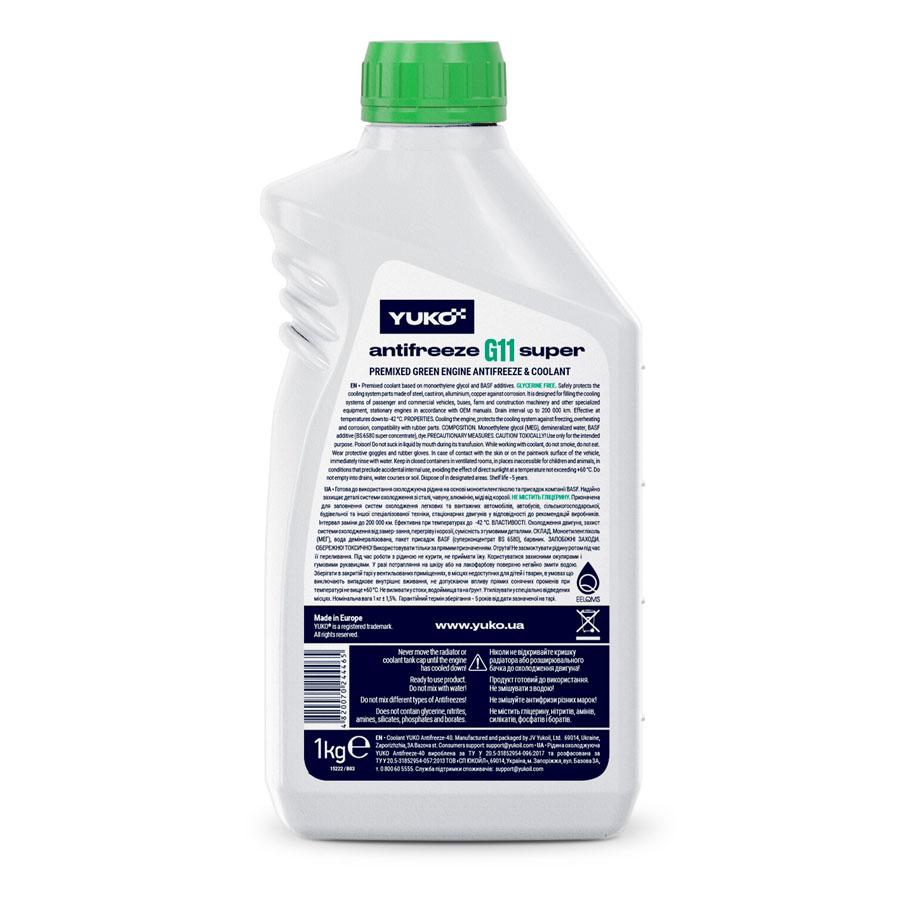 YUKO Antifreeze -40 (Super G11 зелений) - захистить ваш двигун від замерзання, перегріву, корозії та формування шкідливих відкладень. Надійний захист металевих деталей двигуна з чавуну, алюмінію, міді та сталі.
